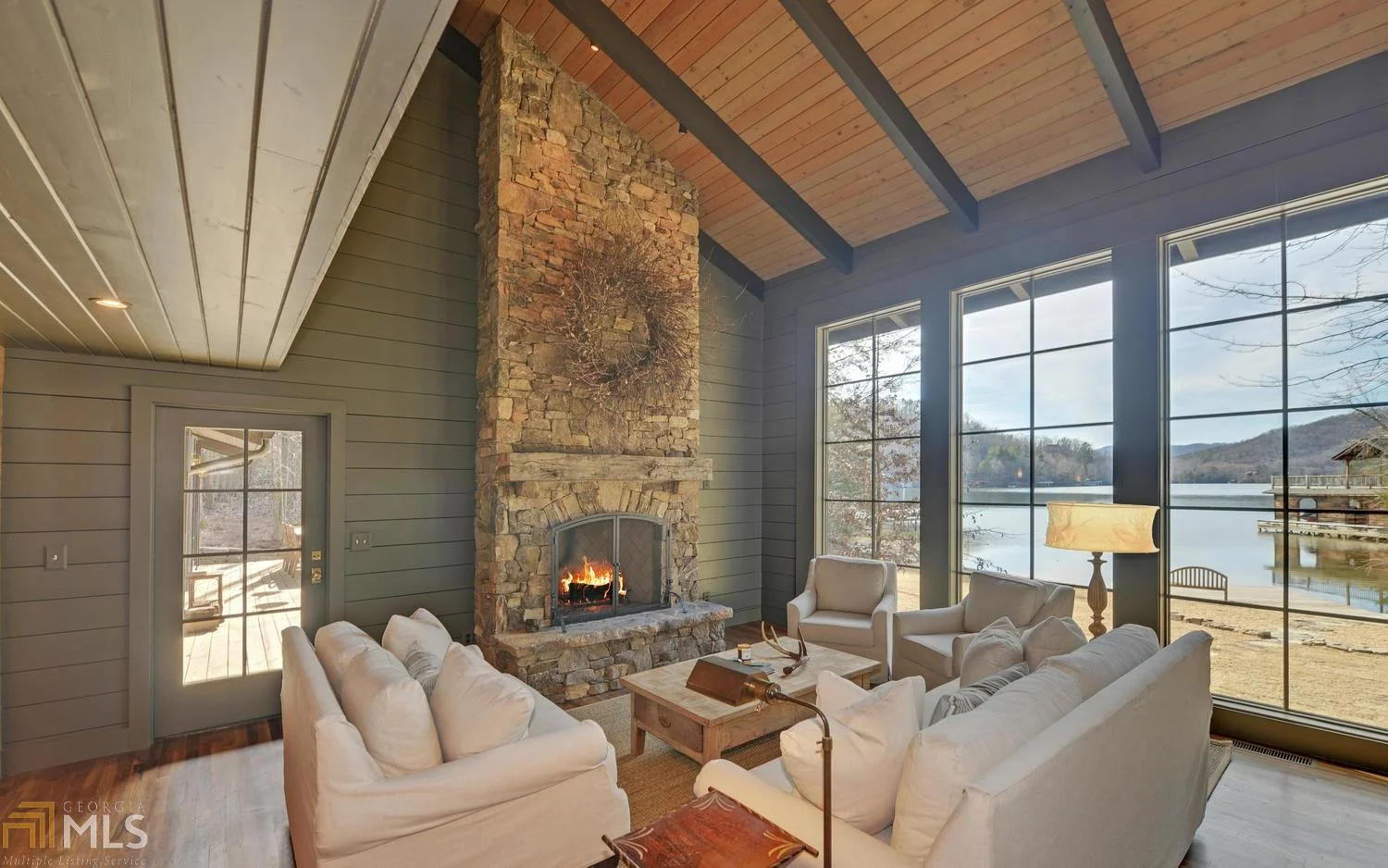 Nostalgic Escape on Lake Burton. 5B 4.5b Farmhouse w rustic charm is a throw back in time. Level yard, steps to lake, close to Waterfall Club and Clayton. Renovated w every detail in mind. Open floor plan,hwd floors, shiplap and board and batten throughout, vaulted ceilings, master and 2 guest rooms on main level, great room w spectacular wall of windows and majestic lake and mtn. views. Grand stone fireplace for those chilly nights. Exquisite chef's kitchen w marble and wood counters, lrg island for entertaining. Covered and open aired porch w outdoor stone fireplace and alfresco dining. Upper floor has 2 bedrooms with bath.Plenty of parking, beautiful landscaping. Let the memories begin!